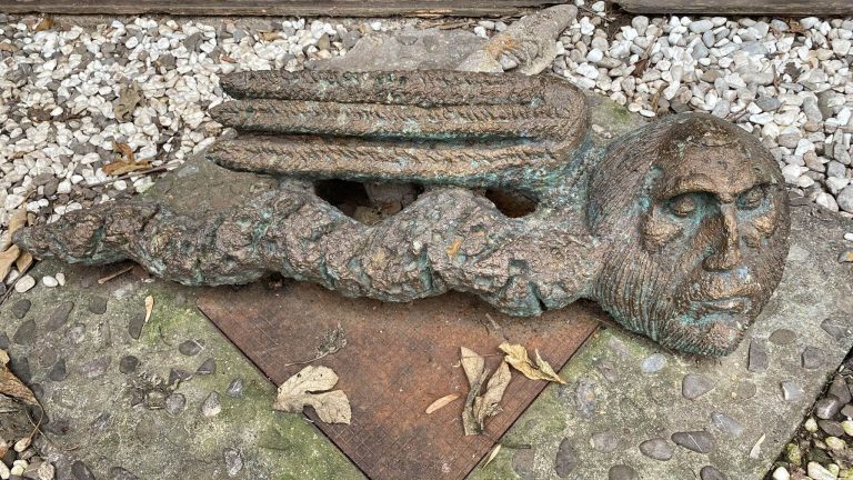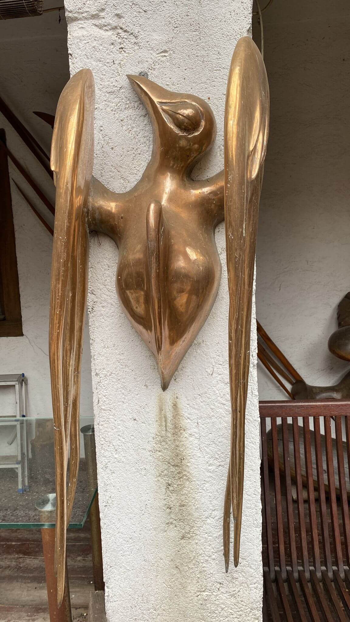 The two sculptures exhibited in Oradea are entitled Fallen Angel and Angel. They form a biblical diptych, shaped by the inspiration and skill of the sculptor. Fallen Angel refers to the famous episode in Genesis 6: „Then the people began to multiply on the earth, and daughters were born to them. The sons of God saw the beautiful women and took any they wanted as their wives”. On the basis of this episode, some ancient texts (the Book of Enoch, the Book of Jubilees, etc.) explain the appearance on earth of a generation of giants, but also the beginning of technical civilisation: fire, metalworking, including, or implicitly, sculpture. In the Book of Revelation, chapter 12, the fallen angel is called Lucifer (‘Light Bearer’, an allusion to the Promethean myth), who rebelled against Yahweh, was overcome by the archangel Michael’s armies and cast into hell. As a very subtle artistic marker, the Fallen Angel is „rusty”, glistening with a hue expressing degradation, perversion, while the Angel, sitting on a high pedestal, has a shiny bronze sheen, symbolising purity and integrity. The shiny bronze is also meant to reflect sunlight during the day and the spotlight at night.